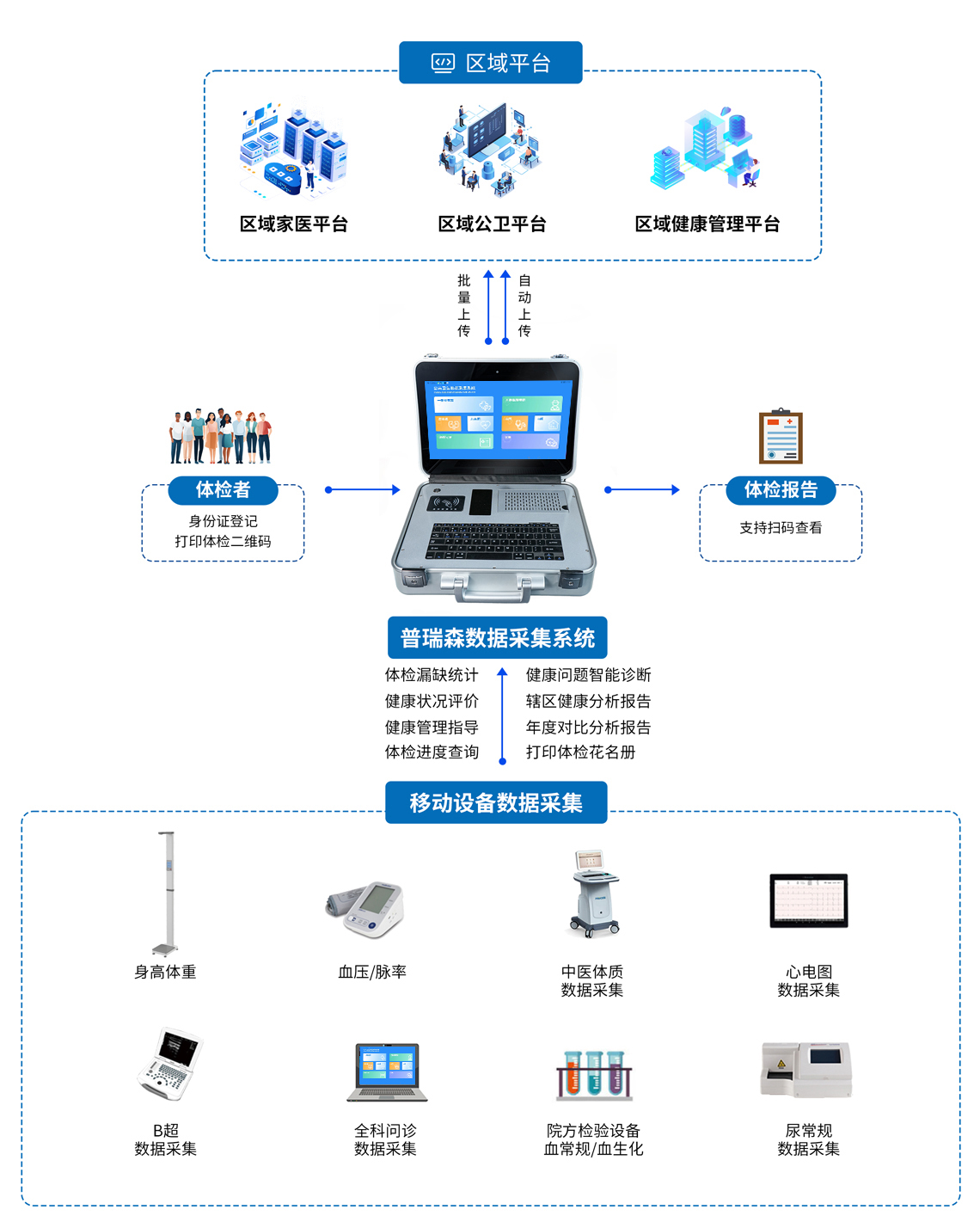 該系統(tǒng)按照縣、鄉(xiāng)、村三級應(yīng)用設(shè)計,以便捷式應(yīng)用、智能化應(yīng)用、多場景應(yīng)用為導(dǎo)向,按照滿足院內(nèi)專業(yè)體檢、下鄉(xiāng)便攜式體檢、移動體檢車體檢及區(qū)域化融合體檢等多種模式搭建,為基層醫(yī)療機(jī)構(gòu)公共衛(wèi)生信息化最后一公里提供一站式解決方案,實現(xiàn)國家“讓數(shù)據(jù)多跑路,百姓少跑腿”的相關(guān)要求。