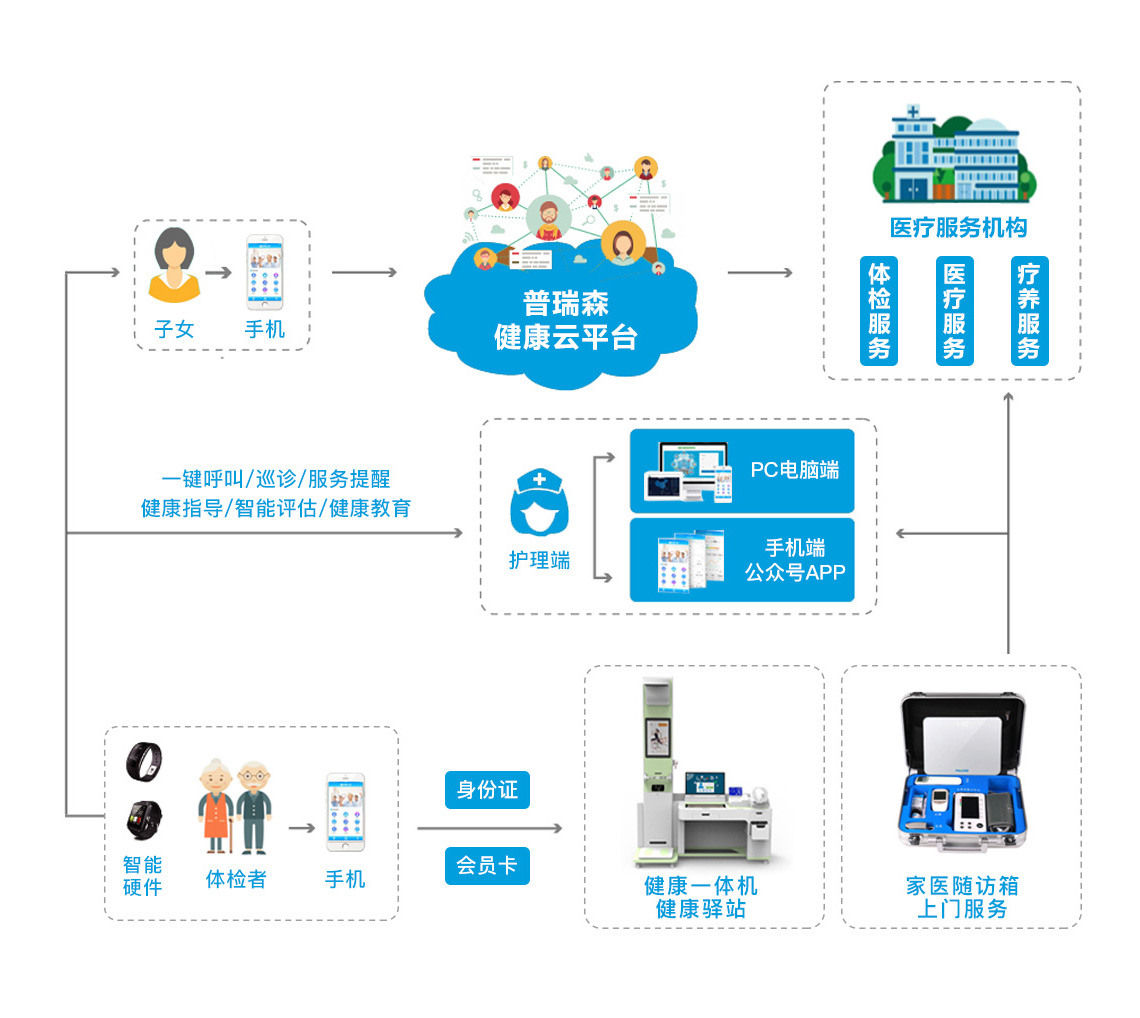 普瑞森·智慧養(yǎng)老解決方案運(yùn)用各種先進(jìn)的信息技術(shù)(物聯(lián)網(wǎng)、互聯(lián)網(wǎng)、移動互聯(lián)網(wǎng)技術(shù)、智能呼叫、云技術(shù)、GPS定位技術(shù)等),創(chuàng)建“系統(tǒng)+服務(wù)+老人+終端”的智慧醫(yī)養(yǎng)服務(wù)模式,并且涵蓋了機(jī)構(gòu)養(yǎng)老、居家養(yǎng)老、社區(qū)日間照料等多種養(yǎng)老形式。 通過跨終端的數(shù)據(jù)互聯(lián)及同步,連通各部門及角色,形成一個(gè)完整的智慧管理閉環(huán),實(shí)現(xiàn)老人與子女、服務(wù)機(jī)構(gòu)、醫(yī)護(hù)人員的信息交互,對老人的身體狀態(tài),安全情況和日;顒舆M(jìn)行有效監(jiān)控,及時(shí)滿足老人在生活、健康、安全、娛樂等各方面的需求。
